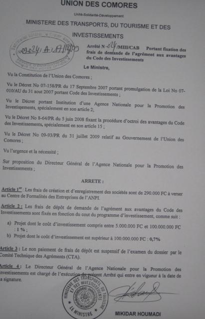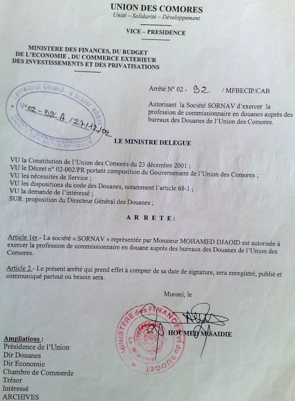 document type Arrêté N° 001/ME-MAS relatif à l'accès aux ports des Comores