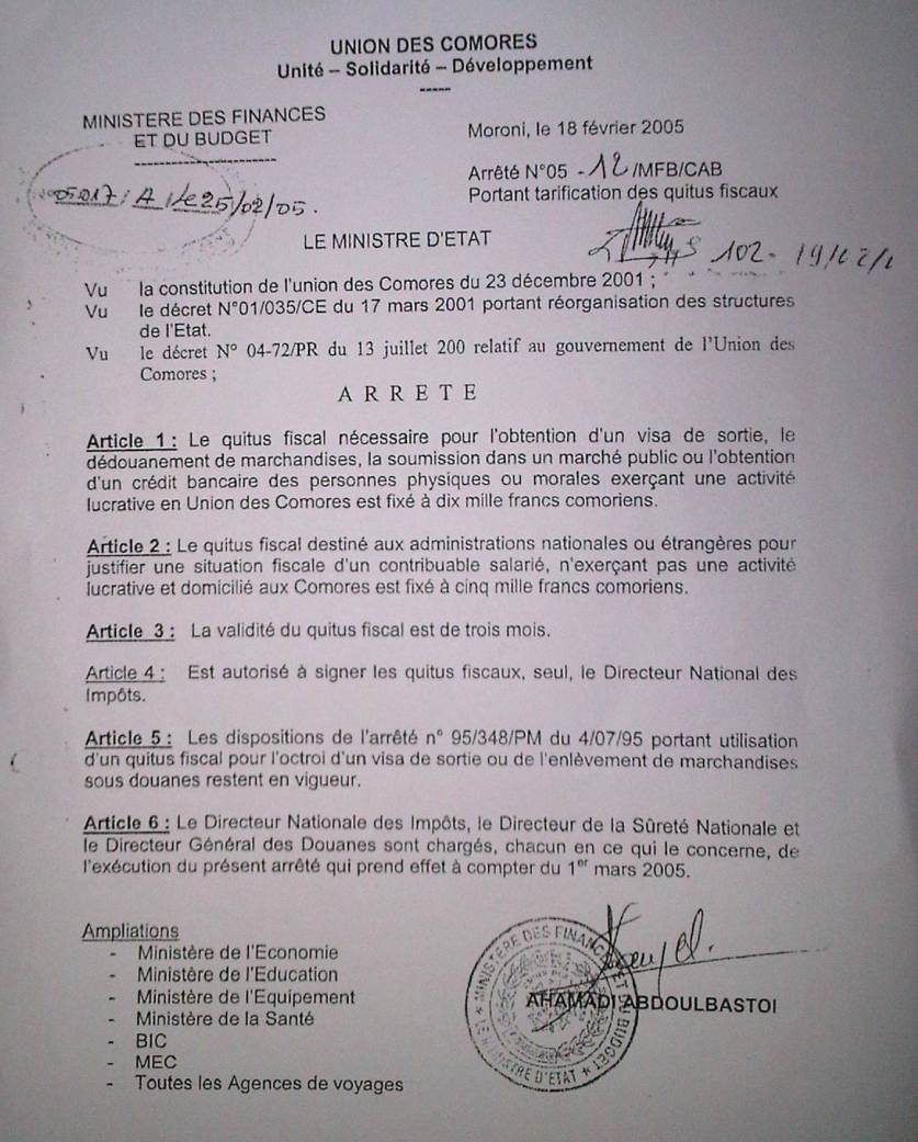 document type Arrêté n° 05-12 portant tarification des quitus fiscaux